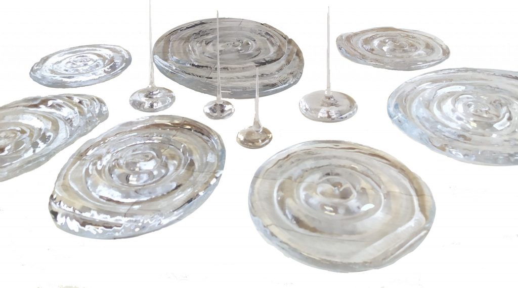 Évasion, est une installation composée de 9 morceaux de bras de poulpe en céramique, acrylique et vernis, face à l’élégance et la fragilité de la matière verre, 5 flaques de verre et stalagmites posés au sol accompagnés de quelques gouttes suspendues.
