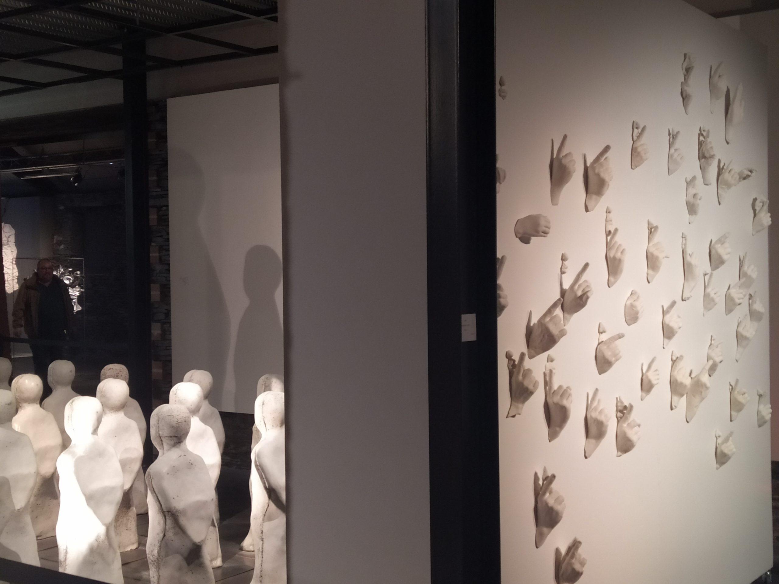 Évasion, est une installation composée de 9 morceaux de bras de poulpe en céramique, acrylique et vernis, face à l’élégance et la fragilité de la matière verre, 5 flaques de verre et stalagmites posés au sol accompagnés de quelques gouttes suspendues.